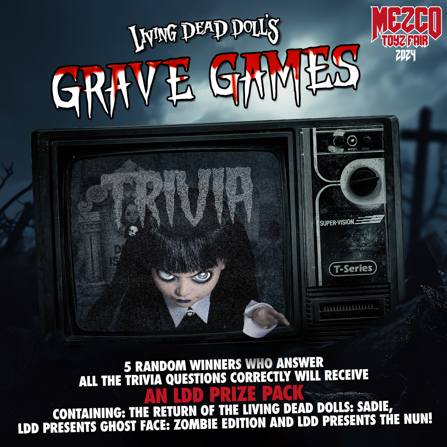 5 random winners who answer all the trivia questions correctly will receive an LDD Prize Pack containing: The Return of The Living Dead Dolls: Sadie, LDD Presents Ghost Face: Zombie Edition, and LDD Presents The Nun!
